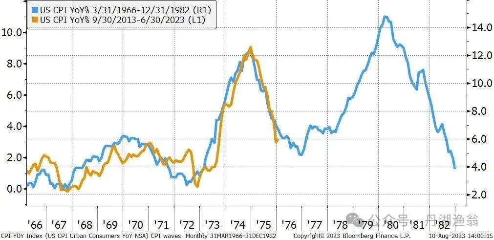 文中提到,2023年8月24日,美国前财政部长、哈佛大学前校长、经济学家Lawrence H. Summers在X上发了下面这张图4。图中蓝色曲线是1966年3月-1982年12月CPI同比(右轴),黄色曲线是2013年9月至2023年6月美国CPI同比(左轴)。两者几乎完全重合。